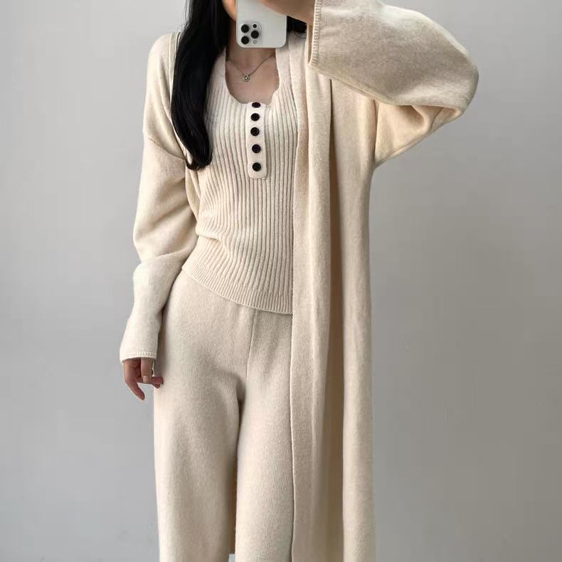 A99 Women's Knitted 3-Piece Set for Autumn & Winter: Long Cardigan + Halter Camisole + Loose Wide-Leg Pants (Cross-Border Export)