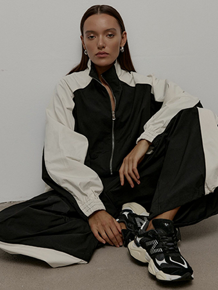 A103 AliExpress Cross-border New Casual Women's Fashion Color Block Drawstring Sports Jacket & Pants Set European American 2-piece
