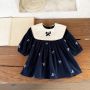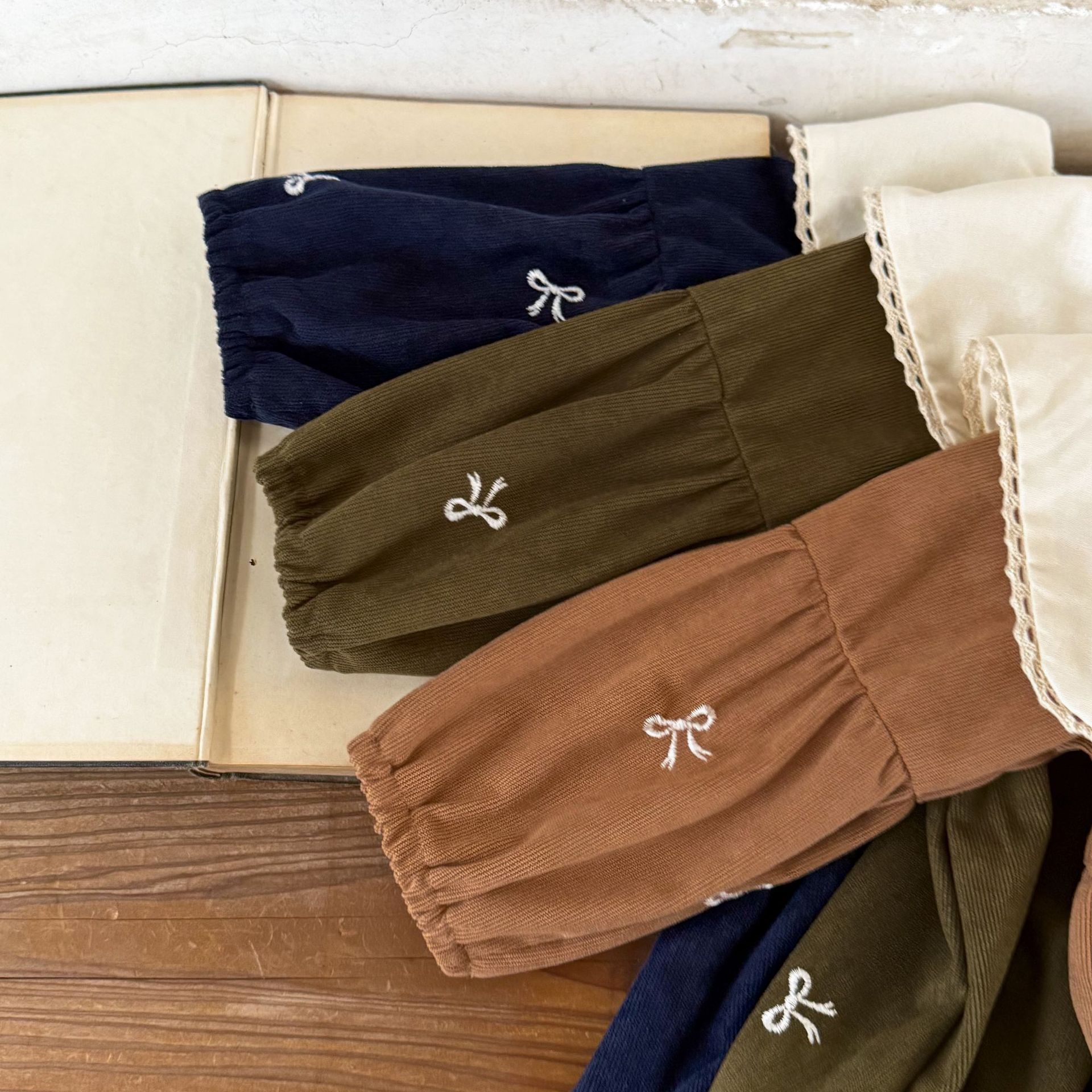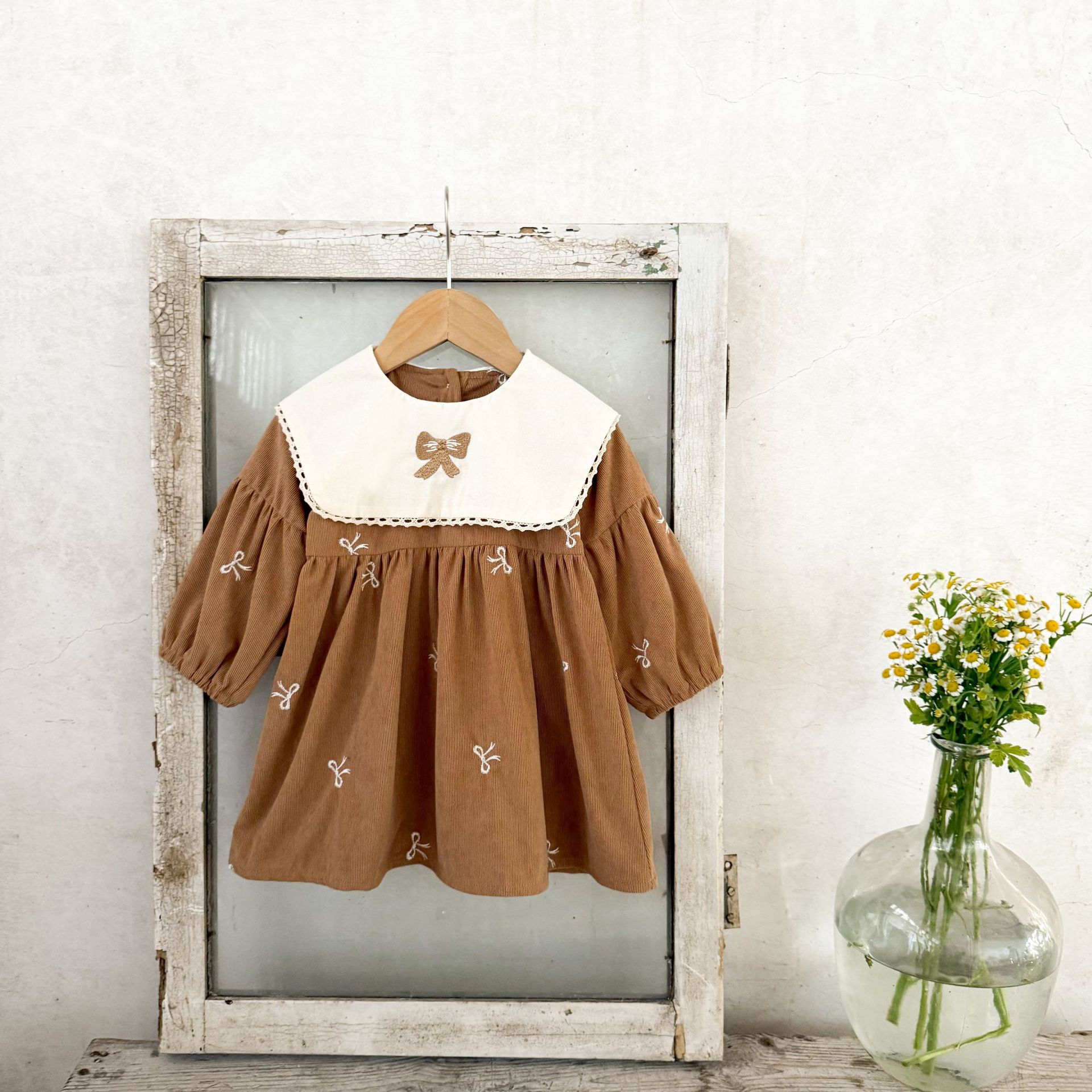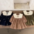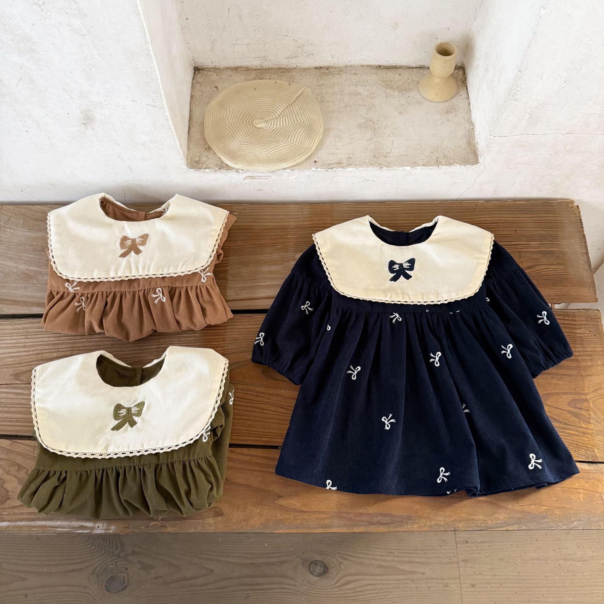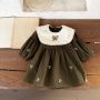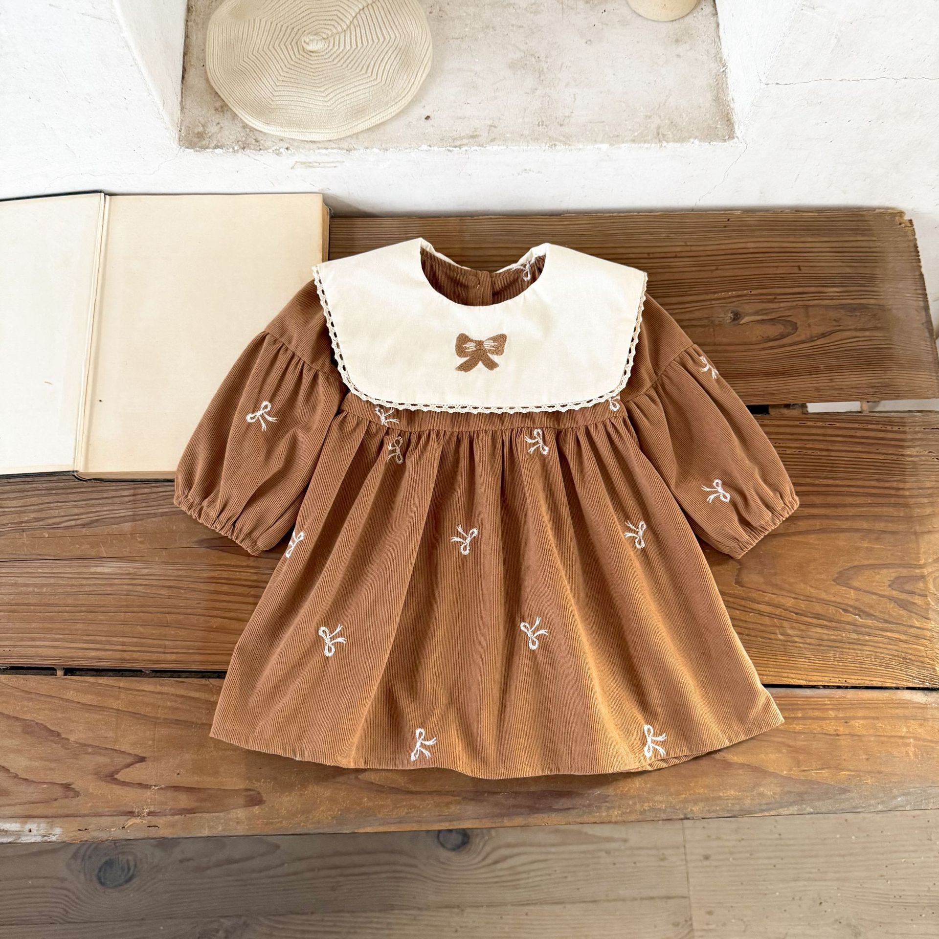 A69 Ins Korean Style Girls' Corduroy Dress Ruffled Bow Embroidery Collar Versatile Casual for Toddlers
